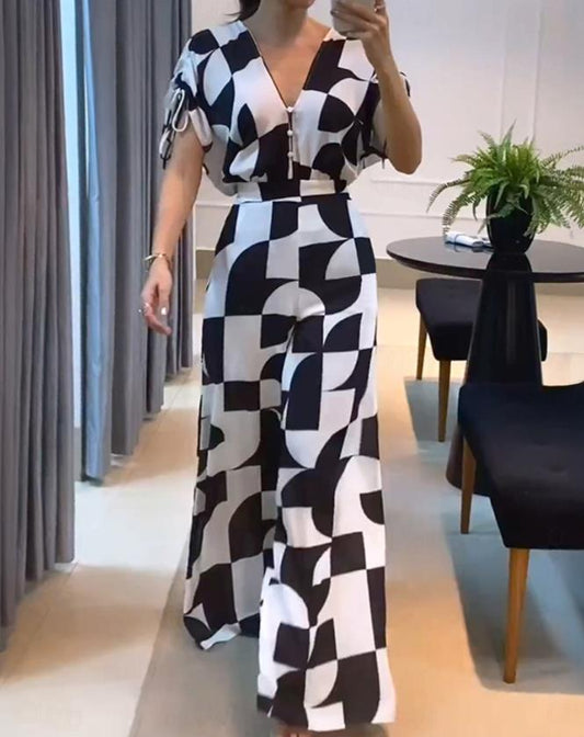 Ave Ajello™ Damski kombinezon z dekoltem w serek i geometrycznym nadrukiem, z szerokimi nogawkami