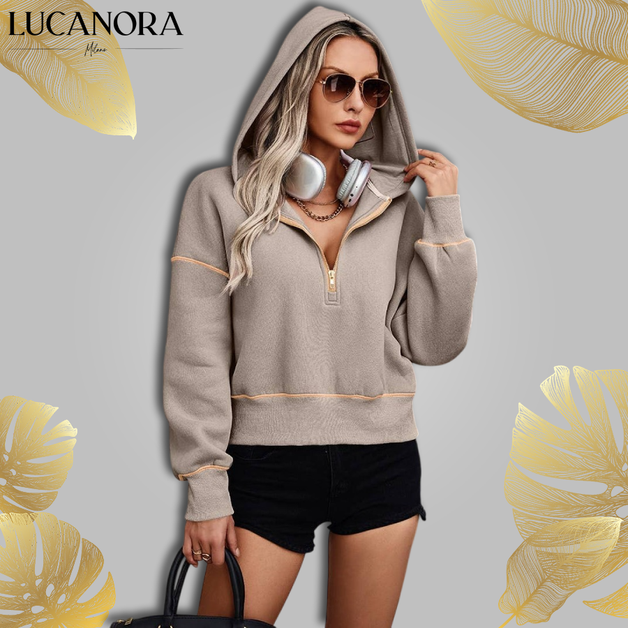 Benigna Sella jest gotowa stać się Twoim ulubionym elementem garderoby. Wyobraź sobie bluzę, która jest miękka, wygodna i idealna na dni, kiedy chcesz się ogrzać i jednocześnie przyciągnąć uwagę. Niezależnie od tego, czy nosisz ją z jeansami, legginsami, czy pod kurtką, ta bluza z kapturem jest dla Ciebie idealna.