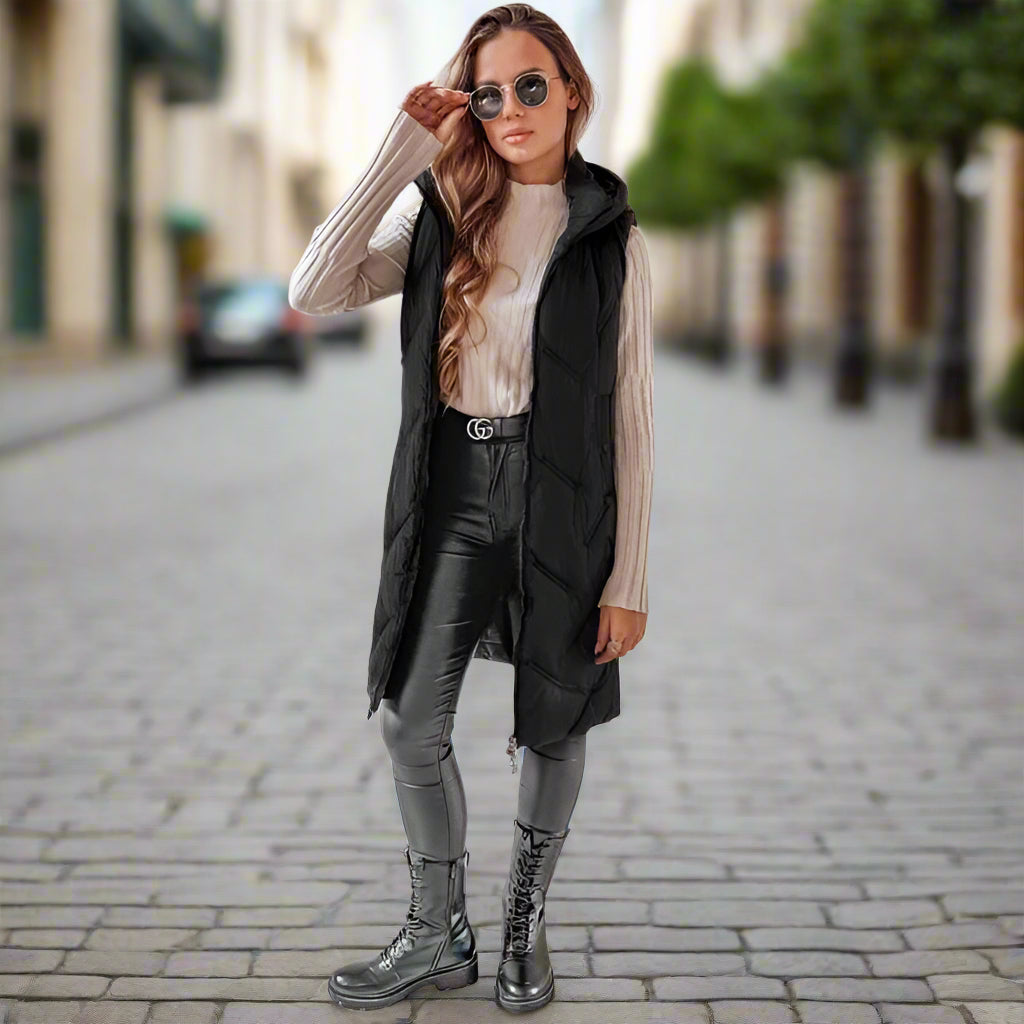 To kamizelka, która staje się najlepszym sprzymierzeńcem w chłodniejsze miesiące. Zapewnia swobodny, warstwowy wygląd, jednocześnie utrzymując ciepło i pełen komfort. Długi, pikowany fason dopasowuje się do sylwetki, a kaptur dodaje nuty casualowego uroku – idealna na poranne spacery, kawę na mieście czy weekendowe wyjście, gdy temperatura spada.