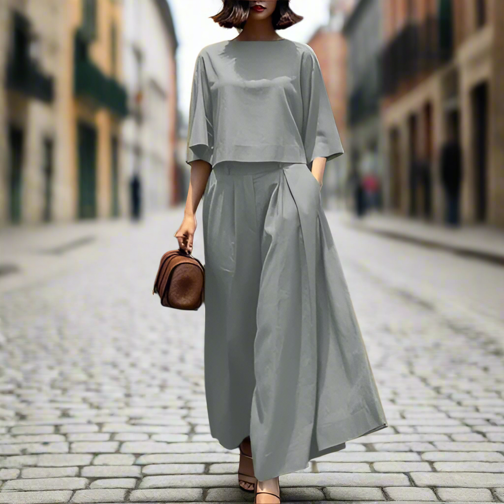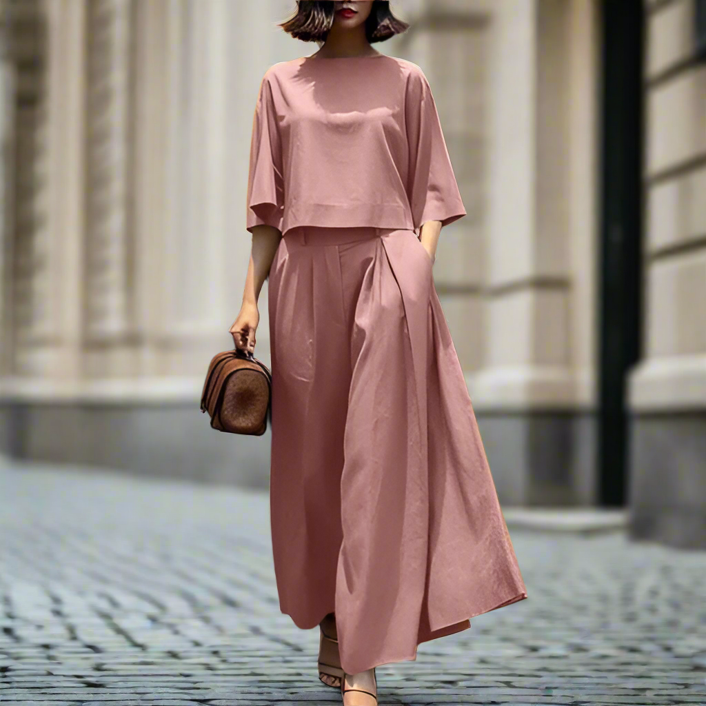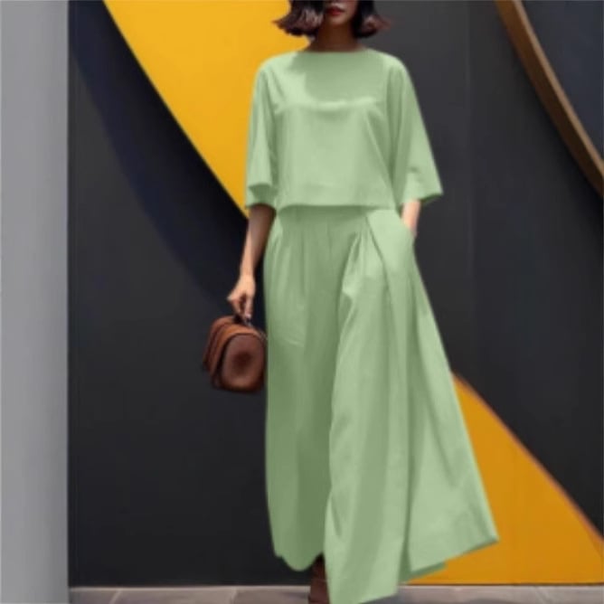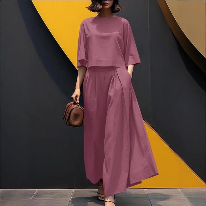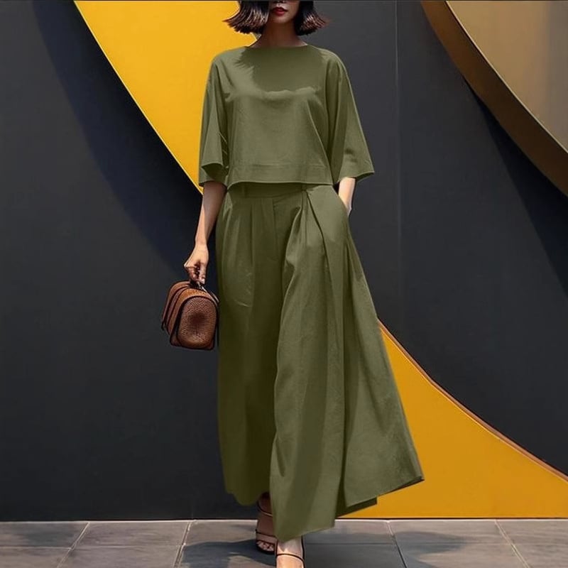 Ten dwuczęściowy komplet odświeża wygląd w jednej chwili. Bluzka z okrągłym dekoltem i rękawem 3/4 oraz spodnie z wysokim stanem i szeroką nogawką tworzą zestaw, który łączy swobodę z elegancją. Luźny krój zapewnia komfort i naturalny ruch — idealny na wyjście, jak i na spokojne chwile w domu.