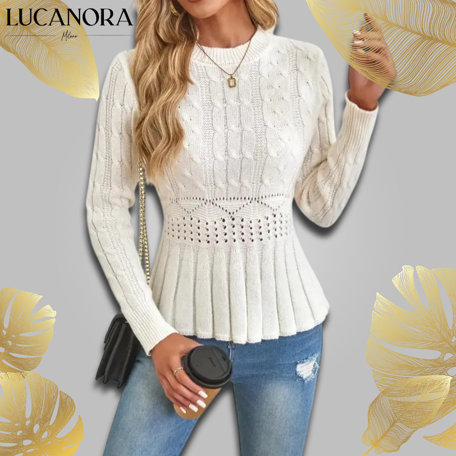 Ten sweter to miękka dzianinowa bluzka z długimi rękawami i okrągłym dekoltem, dopasowująca się dokładnie tam, gdzie powinna. Ma teksturę o splocie plecionym, dopasowany krój i delikatną elastyczność, dzięki czemu jest wygodny, podkreślający sylwetkę i przyjemny w noszeniu.