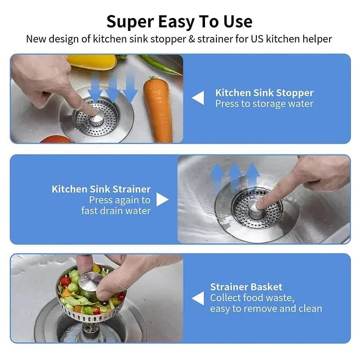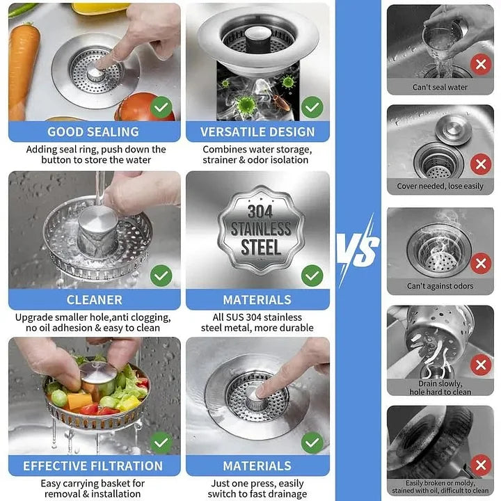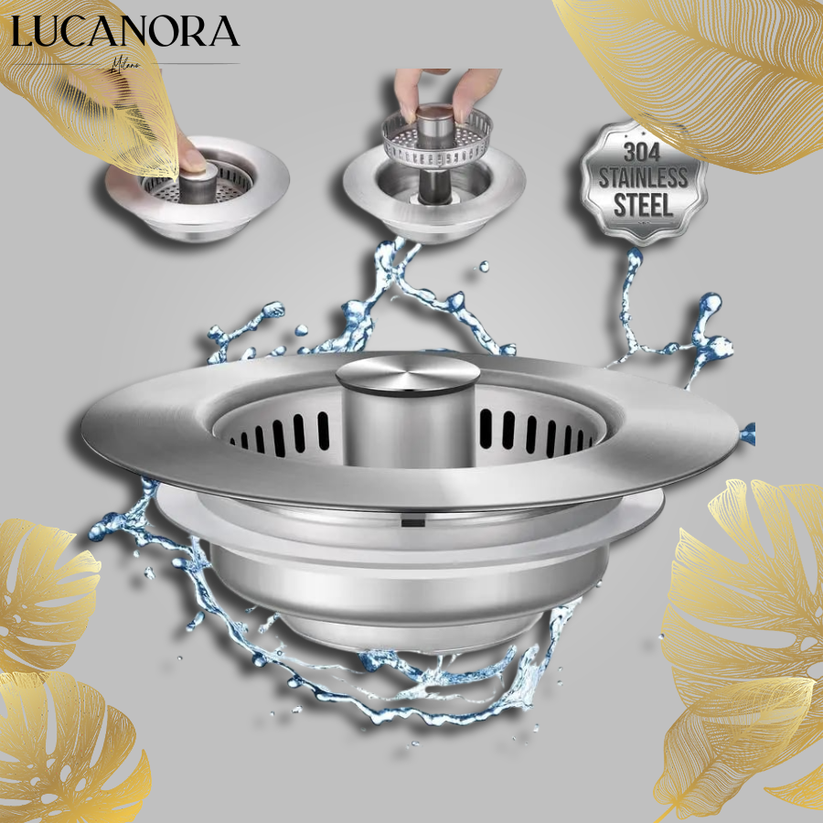 Ten filtr ze stali nierdzewnej łączy w sobie korek, sitko i kosz na odpady w jednym wygodnym urządzeniu. Jednym naciśnięciem możesz zamknąć odpływ, aby namoczyć naczynia, odfiltrować resztki lub szybko spuścić wodę. Koszyk zapobiegający zatykaniu zatrzymuje nawet drobne kawałki jedzenia, a wyskakujący korek pozwala wygodnie regulować przepływ wody.