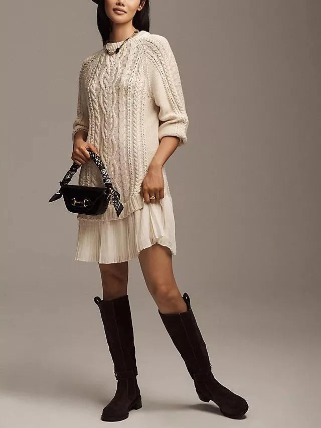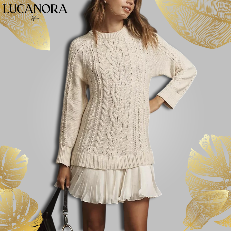 Wyobraź sobie miękki dzianinowy top, podkreśloną talię i zwiewną spódnicę w kształcie litery A, która układa się przy każdym kroku. Góra jest luźna, ale zachowuje kształt sylwetki, subtelnie obejmując talię i biodra. To idealny wybór na chłodniejsze dni — otula ciepłem, nie rezygnując ze stylu.