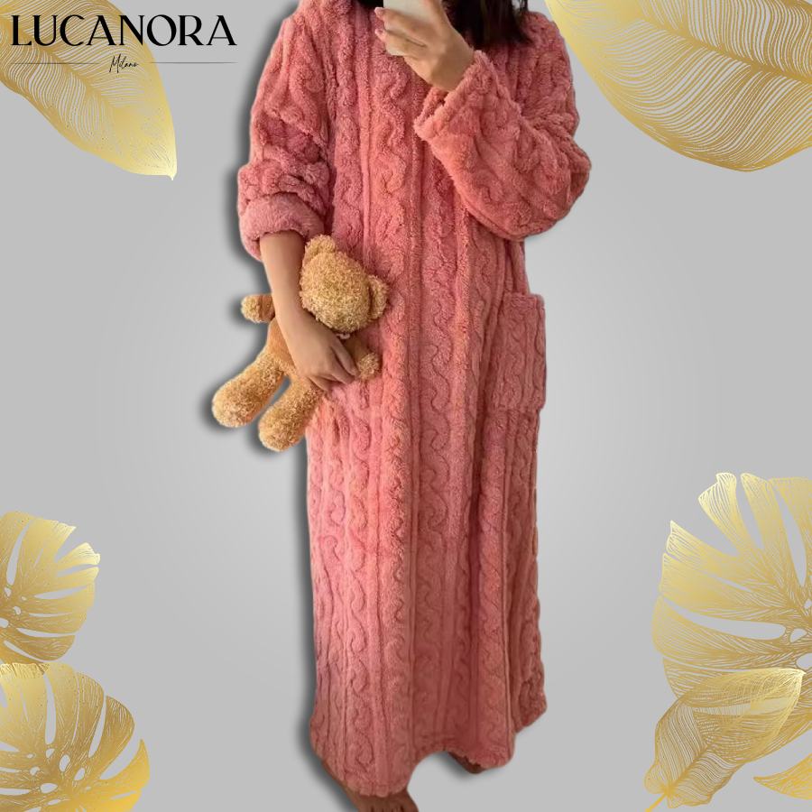 Otulające uczucie: Koszula nocna wykonana jest z wyjątkowo miękkiego, wysokiej jakości polaru, który zapewnia przytulność i komfort. Utrzymuje ciepło blisko skóry, dzięki czemu nawet zimne noce stają się przyjemne i relaksujące.