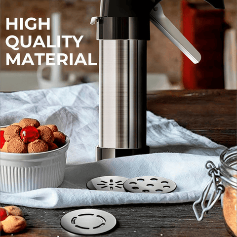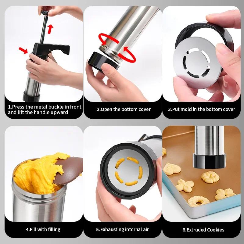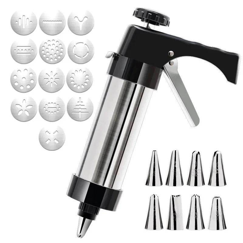 Zestaw zawiera: 13 dysków do formowania ciasteczek + 8 końcówek dekoracyjnych + urządzenie do wyciskania