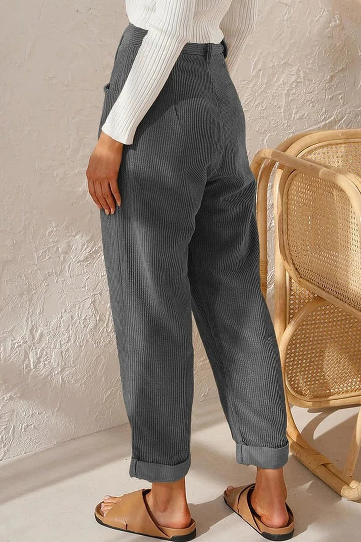 Wykonane z wysokiej jakości sztruksu, spodnie oferują idealną równowagę między miękkością, strukturą i ponadczasowym wyglądem. Średni stan zapewnia całodzienny komfort, a zamek błyskawiczny i ozdobne guziki dodają wyjątkowego charakteru. Noś je z podwiniętymi nogawkami, aby uzyskać swobodny styl, lub z obcasami, aby uzyskać bardziej elegancki wygląd. Te spodnie pasują do każdej okazji.