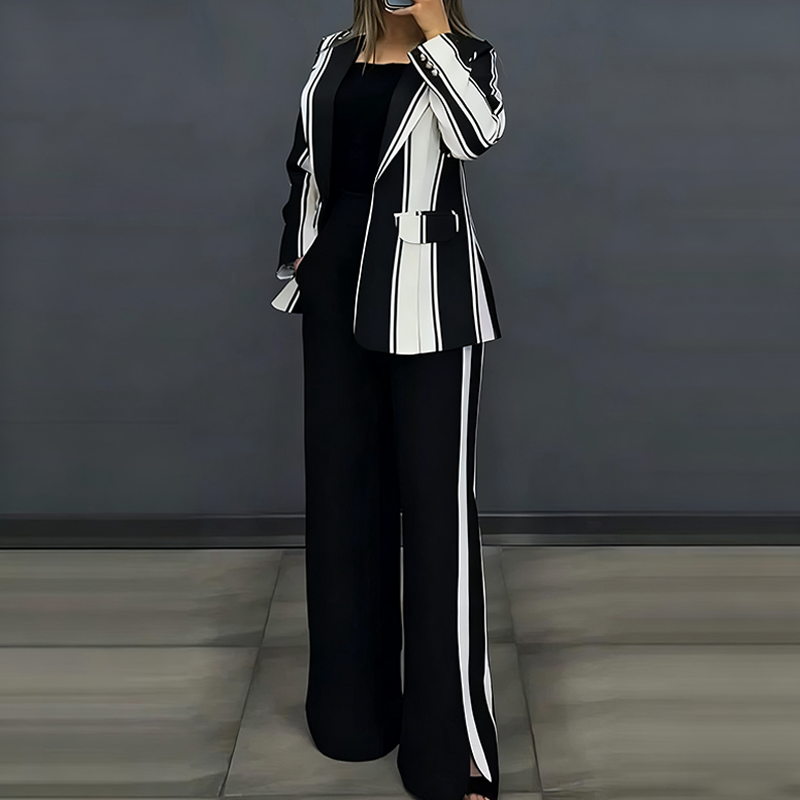 Modny, nowoczesny design: zestaw łączy klasyczną marynarkę o dopasowanym kroju ze spodniami z szerokimi nogawkami, które nadają sylwetce lekkości i wdzięku. Subtelne pionowe paski i blokowe kolory wysmuklają figurę i przyciągają wzrok, tworząc efekt „elegancji bez wysiłku”.