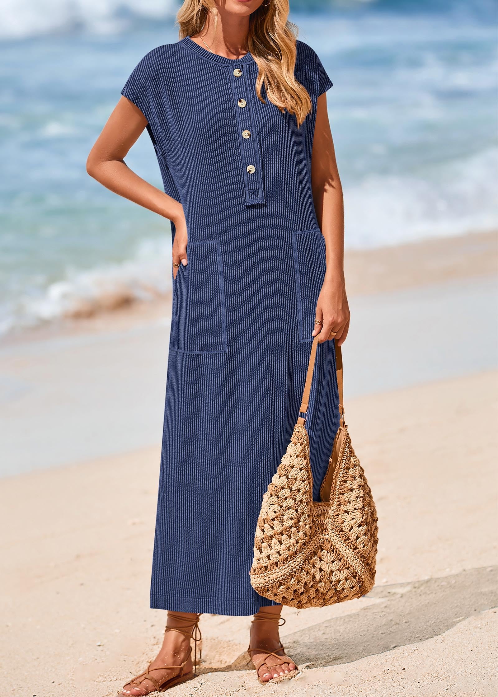 Ta sukienka maxi została uszyta z miękkiej dzianiny, która dopasowuje się do sylwetki i zapewnia wygodę przez cały dzień. Luźne krótkie rękawy, eleganckie guziki z przodu i kobiecy, wydłużający sylwetkę krój sprawiają, że możesz ją nosić zarówno na spotkanie w mieście, randkę, jak i na domowy relaks.