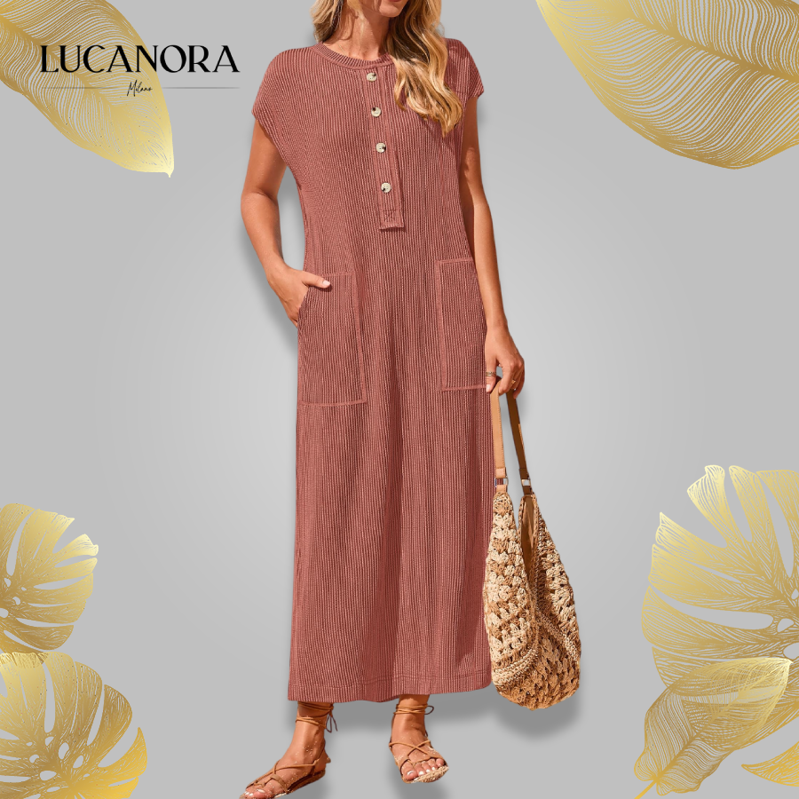 Guenda Manzo™ Sukienka dzianinowa maxi z krótkimi rękawami i guzikami