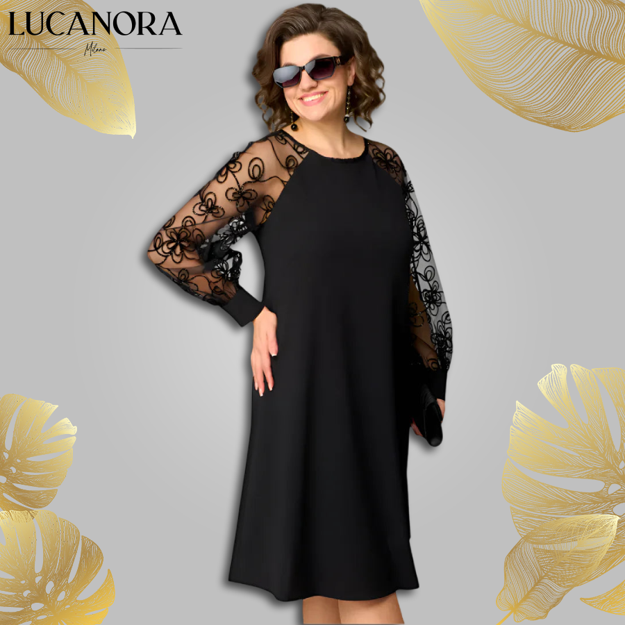 Ta sukienka to Twoja nowa tajna broń. Ma elegancki krój w linii A, który podkreśla kobiecą sylwetkę, nie opinając ciała, nadając swobodny i szykowny wygląd. Prześwitujące rękawy z koronkowymi zdobieniami dodają efektu „elegancka, ale swobodna”, dzięki czemu sprawdzi się na każdą okazję – od spotkań przy stole, po przyjęcia w ogrodzie.