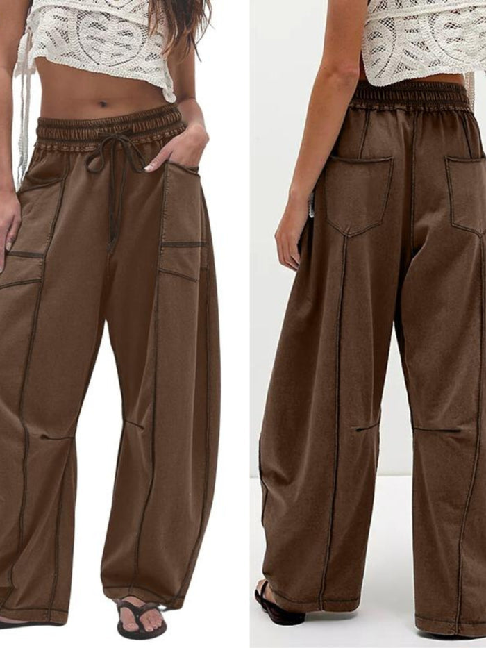 Mają ultraluźny krój z szerokimi nogawkami, które pięknie układają się na sylwetce, oraz wygodną gumkę w pasie z marszczeniem i regulowanym sznurkiem, dzięki czemu dopasują się idealnie. Niezależnie od tego, czy jesteś na zakupach, pijesz kawę, czy po prostu relaksujesz się – te spodnie łączą styl, wygodę i pełną swobodę ruchów.