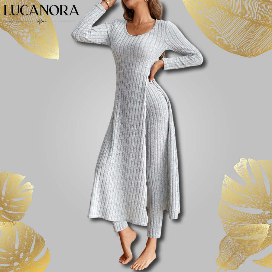 ✔ Uniwersalny na każdą okazję: ten zestaw idealnie sprawdzi się zarówno podczas „przytulnego dnia w domu”, jak i „brunchu z przyjaciółmi”. Połącz go ze sneakersami lub czółenkami – zawsze będzie wyglądał świetnie. Dzięki czystym liniom i neutralnym kolorom będziesz do niego wracać wielokrotnie.