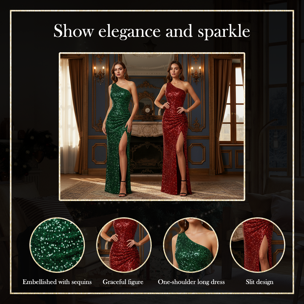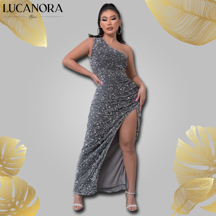Olśniewający blask cekinów – przygotuj się, by błyszczeć. Sukienka pokryta jest luksusowymi cekinami, które odbijają każdy promień światła. Niezależnie od tego, czy wchodzisz do pokoju, czy schodzisz po schodach — zabłyśniesz z każdej strony.