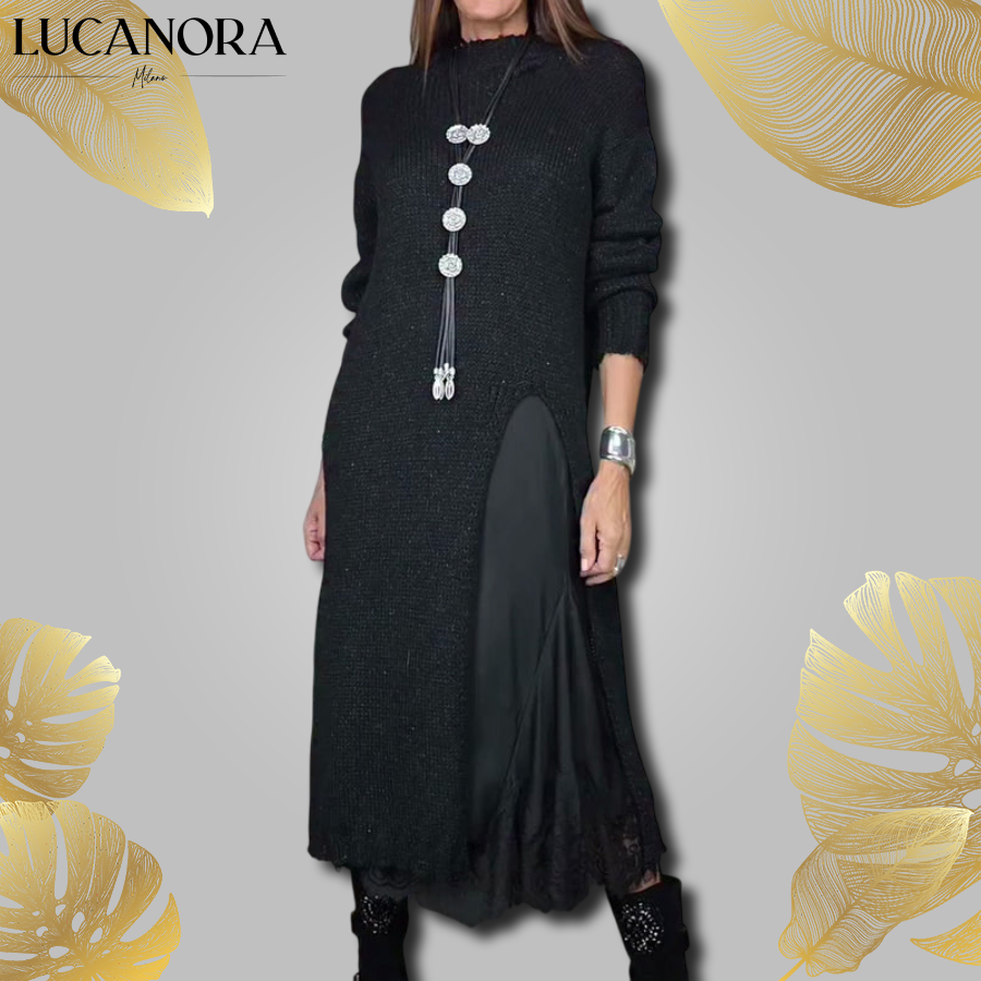 Dopasowany krój dla każdej sylwetki: Sukienka z dzianiny delikatnie otula ciało, podkreślając kształty bez ucisku, a luźny sweter tworzy stylową warstwę zewnętrzną, która równoważy proporcje i nadaje całości lekkości. Efekt? Elegancja z odrobiną swobodnego wdzięku.