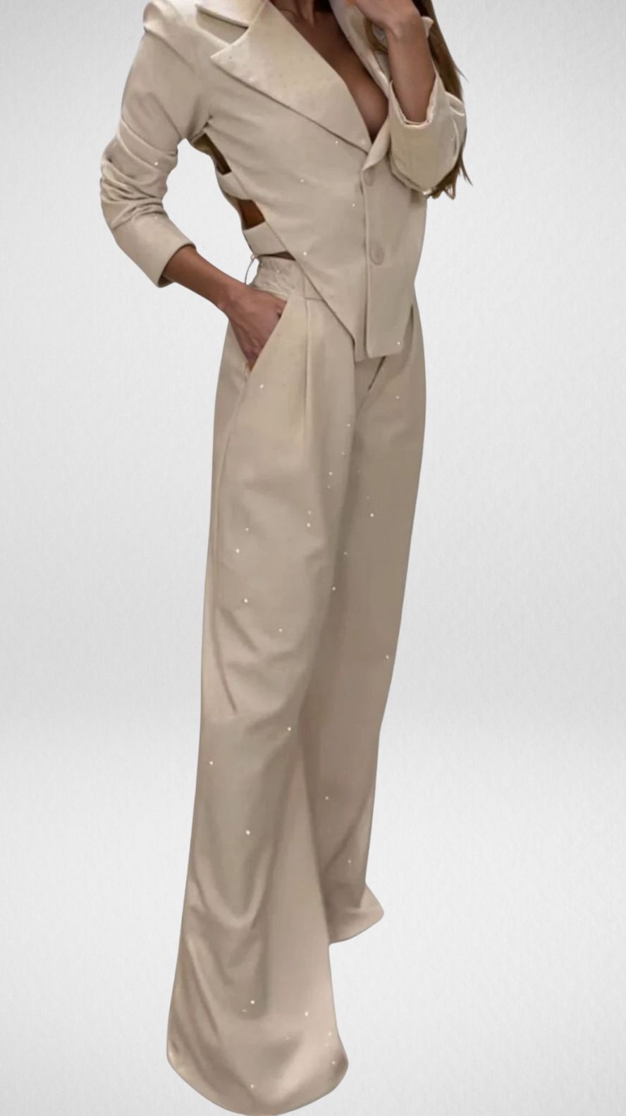 Od pierwszego guzika marynarki do ostatniego zamka spodni, ten garnitur podkreśla Twoją osobowość. Jego ustrukturyzowany krój podkreśla sylwetkę, wysokiej jakości materiał zapewnia komfort przez cały dzień, a subtelne detale — takie jak nieregularny kołnierzyk z klapami i minimalistyczny design — opowiadają historię nowoczesnej elegancji.